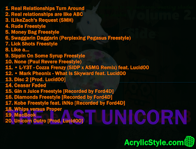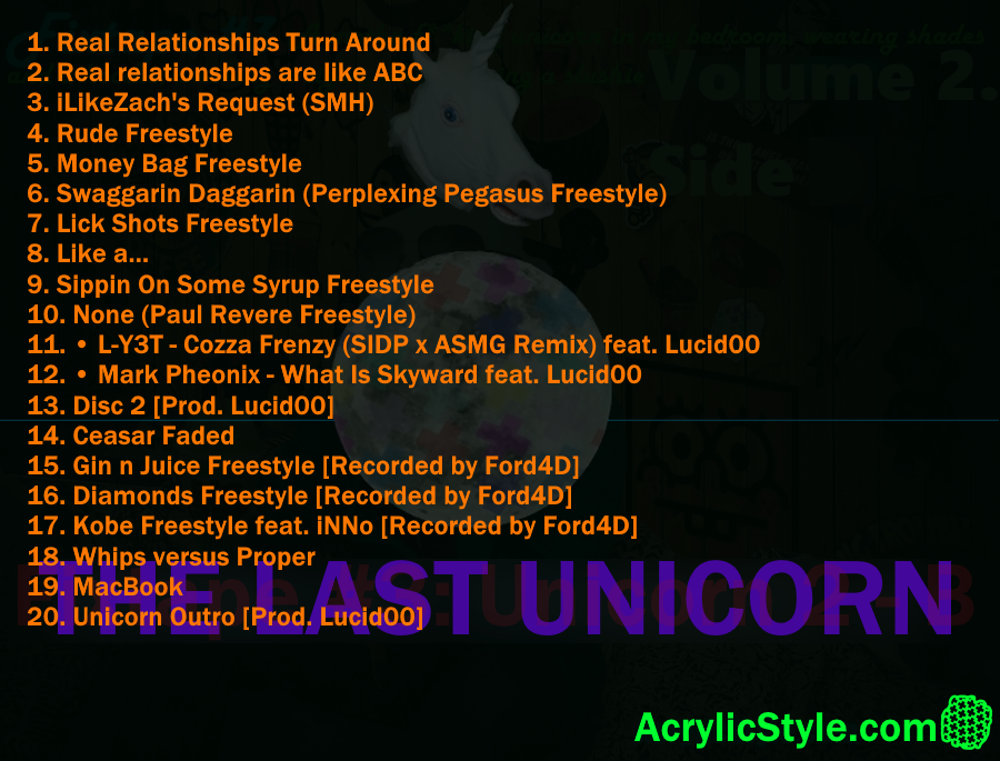 Just like the last one, this still ain't it. This ain't the real stuff. 20 songs of more messing around (listed as disc 1 and 2). One song is an unreleased Mark Pheonix track from 2010 that Lucid00 decided to rap on now for whatever reason. Another is something dope from L-Y3T. iNNo makes a guest appearance on a track. This is the last Unicorn fixtape. Any following fixtape will be different. NEP is on the way next.